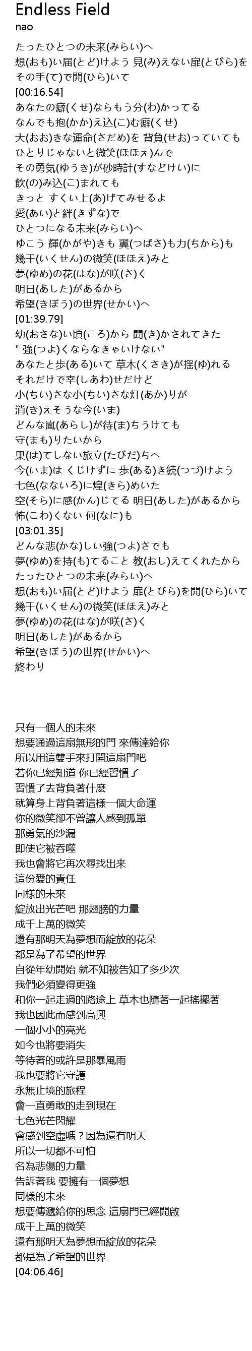 | [03:38.72] | たったひとつの未来(みらい)へ |