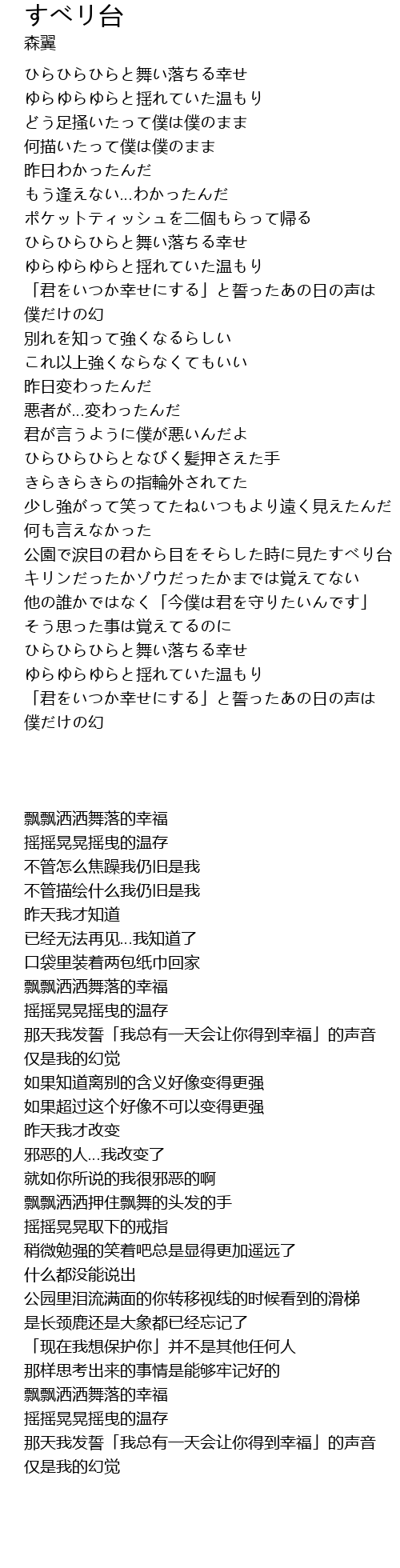 | [02:46.930] | 公園で涙目の君から目をそらした時に見たすべり台 |