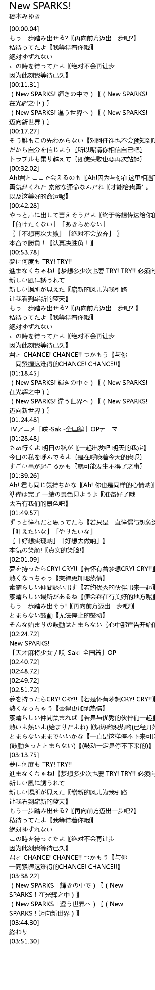 | [00:14.82] | (New SPARKS! 違う世界へ)〖(New SPARKS! 迈向新世界)〗 |