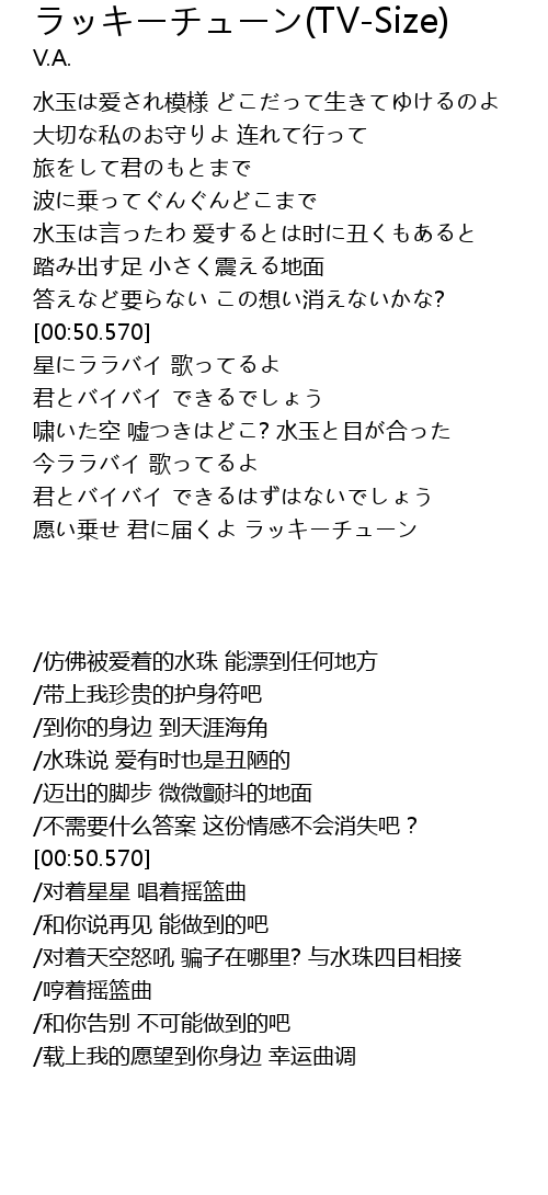 | [01:17.990] | 愿い乗せ 君に届くよ ラッキーチューン |