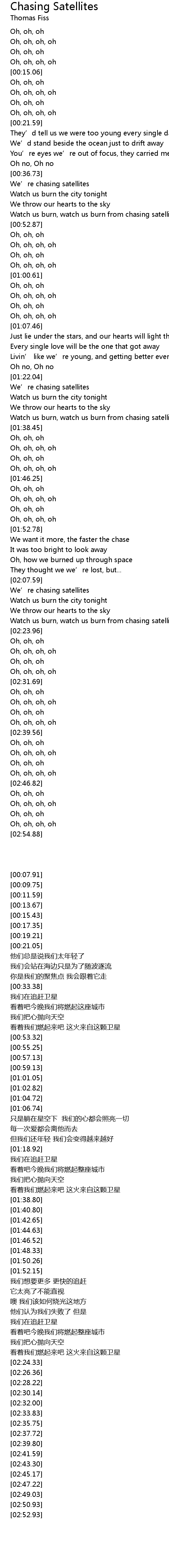 | [02:19.63] | Watch us burn, watch us burn from chasing satellites |