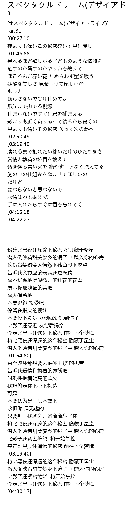 | [03:11.64][04:22.27] | 星より遠いその秘密 奪って次の夢へ |