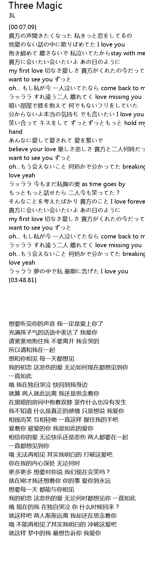 | [03:10.94] | my first love 切なさ愛しさ 貴方がくれたの今だって want to see you ずっと |