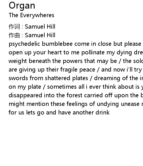 | open up your heart to me pollinate my dying dreams can you feel the organs weight beneath the powers that may be the soldiers trapped inside our teeth are giving up their fragile peace and now i' ll try to separate the broken swords from shattered plates dreaming of the interstate and organs served up on my plate sometimes all i ever think about is you right in front of me brian disappeared into the forest carried off upon the breeze sadie will arrive and i might mention these feelings of undying unease rillas on the front porch waiting for us lets go and have another drink |