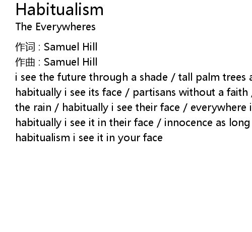 | i see the future through a shade / tall palm trees and shallow graves / habitually i see its face / partisans without a faith / marching slowly through the rain / habitually i see their face / everywhere i go it looks the same / habitually i see it in their face / innocence as long as you are tame / habitualism i see it in your face |