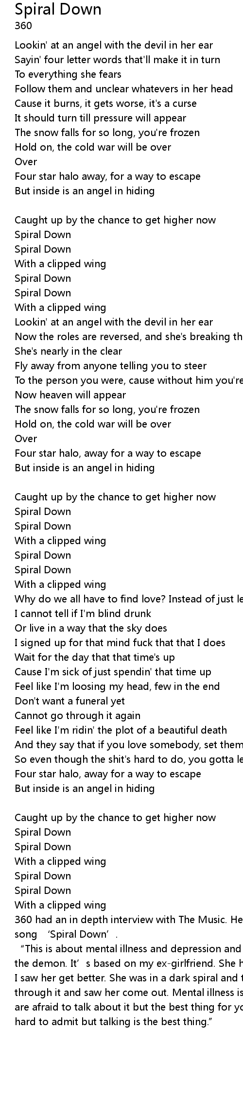 | 360 had an in depth interview with The Music. Here is what he said about his song ' Spiral Down'. | |