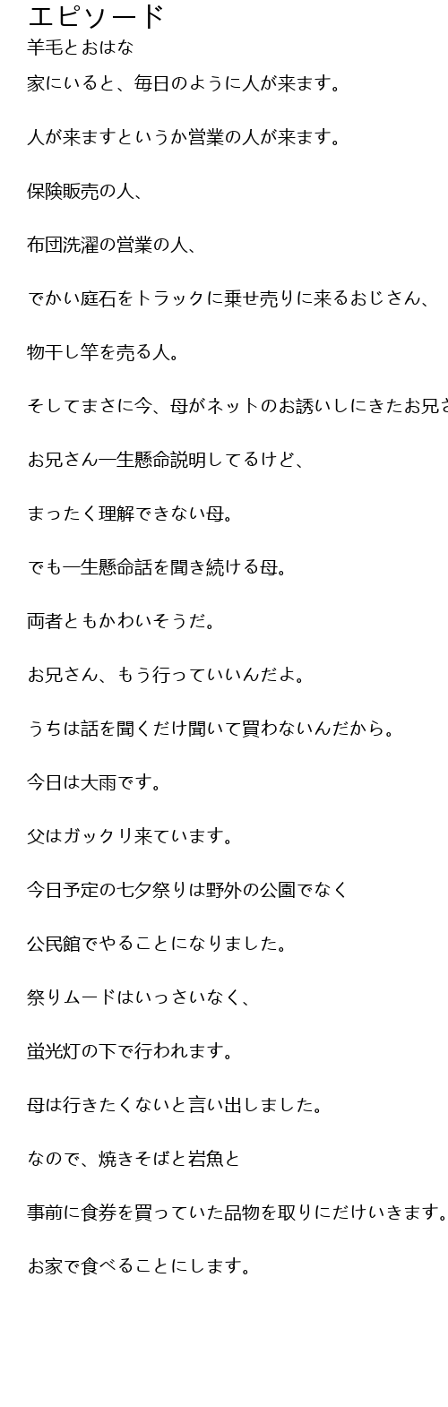 | そしてまさに今、母がネットのお誘いしにきたお兄さんの相手をしています。 | |