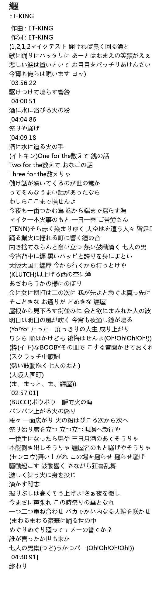 | [04:22.22][04:04.86][02:24.48][00:52.66][00:35.51] | FIRE夜空を焦がせ 纒屋 祭りや騒げ |