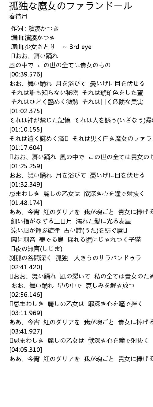 | [03:41.927] | 忌まわしき 麗しの乙女は 欲深き心を瞳で射抜く |