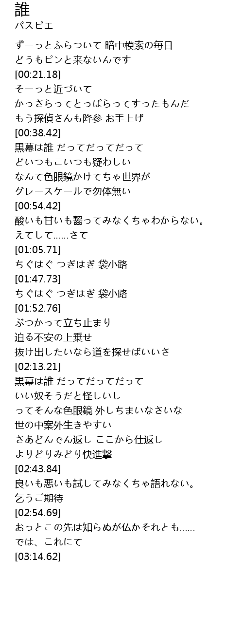| [00:38.89] | 黒幕は誰 だってだってだって |