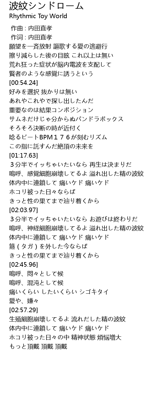 | [02:57.54] | 生殖細胞崩壊してるよ 流れだした精の波紋 |
