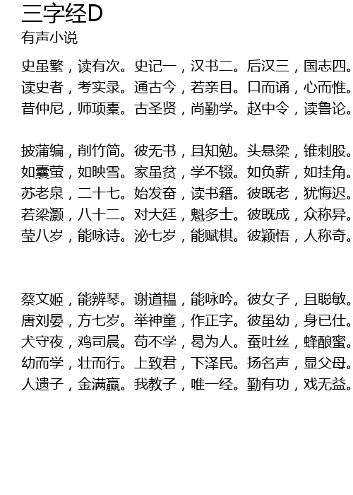 | 如囊萤,如映雪。家虽贫,学不辍。如负薪,如挂角。身虽劳,犹苦卓。 | |
