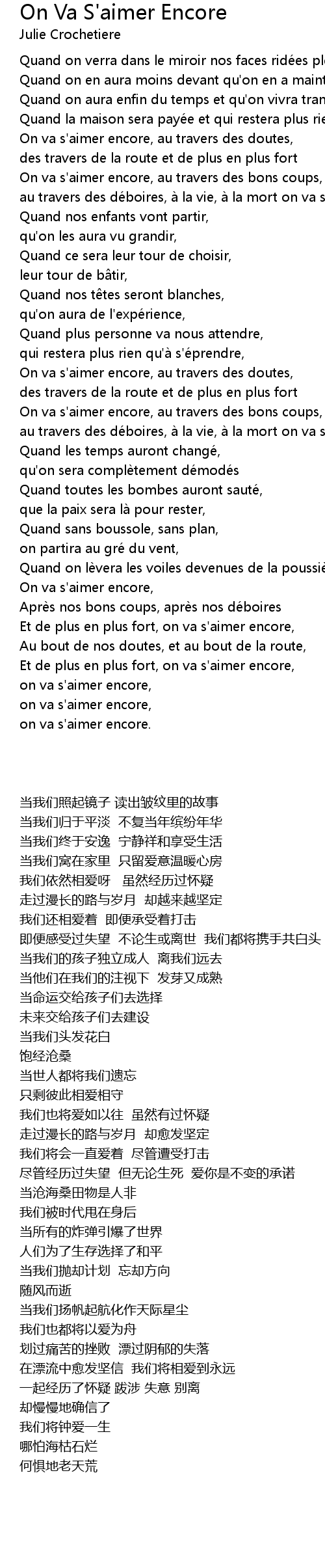 | [02:18.82] | au travers des de boires, a la vie, a la mort on va s' aimer encore |