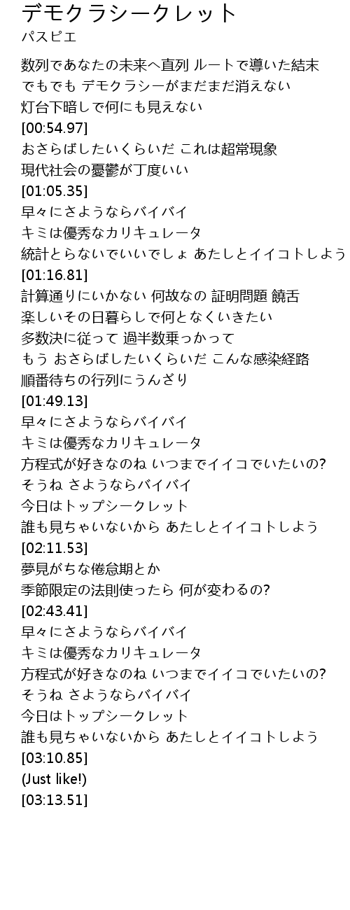 | [02:59.45] | そうね さようならバイバイ 今日はトップシークレット |