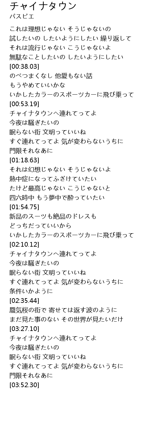 | [00:55.79] | チャイナタウンヘ連れてってよ |