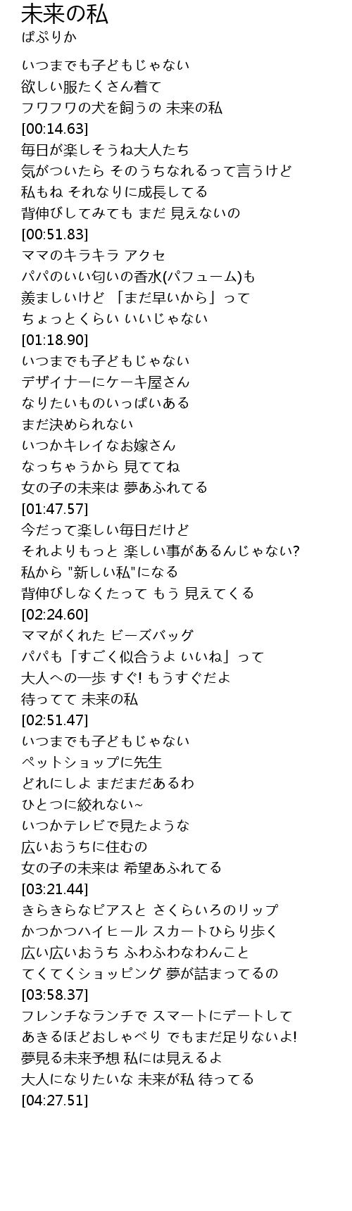 | [03:13.24] | 女の子の未来は 希望あふれてる |