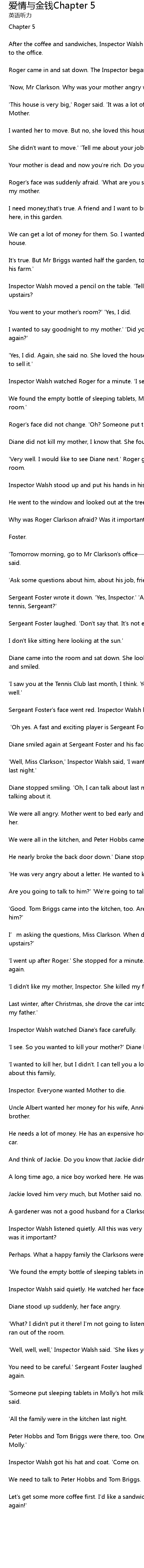 | [00:05.73] | After the coffee and sandwiches, Inspector Walsh called Roger Clarkson to the office. |