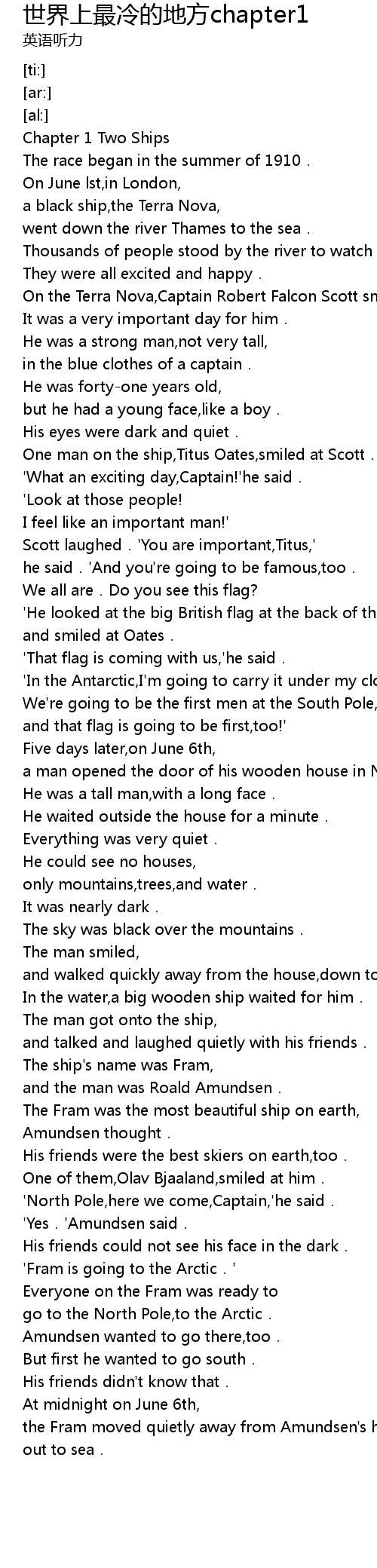 | [01:05.90] | On the Terra Nova,Captain Robert Falcon Scott smiled quietly. |