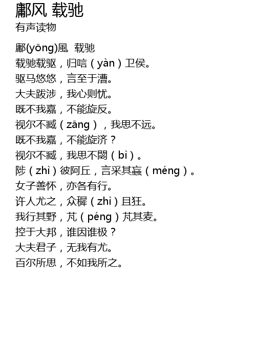 | [00:03] | 载驰载驱,归唁(yàn)卫侯。 |