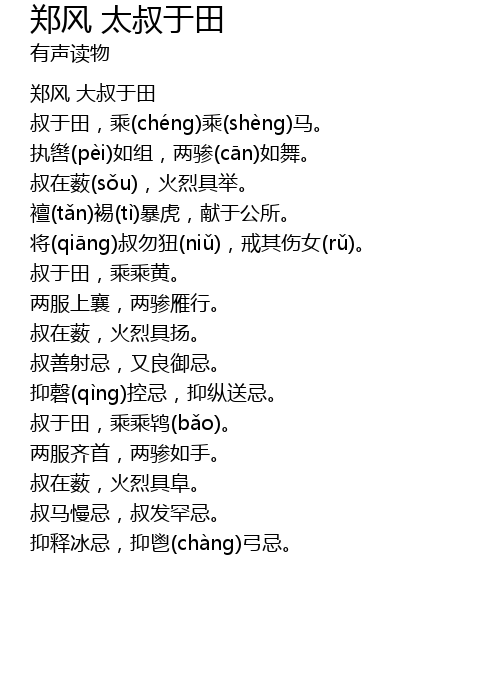 | [00:04] | 叔于田,乘(chéng)乘(shèng)马。 |