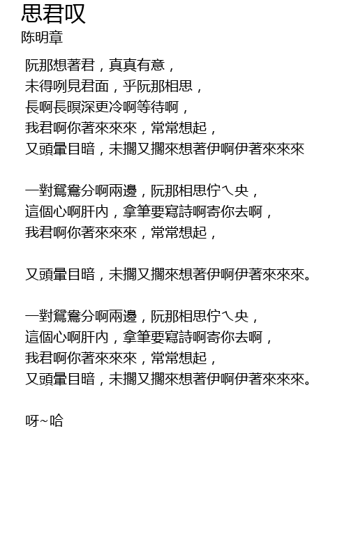 | 這個心啊肝內,拿筆要寫詩啊寄你去啊, | |