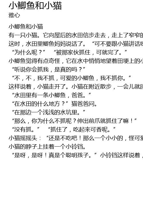 | yǒu yì zhī xiǎo māo. tā xiàng wū hòu de shuǐ tián xìn bù zǒu qù, zǒu shàng le zhǎi zhǎi de tián gěng. shuǐ tián zhōng yǒu yī tiáo xiǎo jì yú, kàn dào le bái sè de xiǎo māo, wèn dào:" nǐ shì shuí ya?"" wǒ shì xiǎo māo." xiǎo māo huí dá shuō, tā nà yuán yuán de yǎn jīng dī liū dì kàn zhe xiǎo jì yú. zhè shí, shuǐ tián lǐ jì yú mā mā shuō huà le." kě bú yào gēn xiǎo māo jiǎng huà ya, yī shēng bù xiǎng dì kuài duǒ kāi ba, bié chǎo rǎng!" " wèi shí me ne?" " bèi nà jiā huo zhuā zhù, kě jiù wán le." xiǎo jì yú jué de yǒu diǎn qí guài, tā zài shuǐ zhōng qiāo qiāo dì wàng zhe tián gěng shàng de xiǎo bái māo. " tīng shuō nǐ huì zhuā wǒ, shì zhēn de ma?" " bù, bù, wǒ bù zhuā, kě ài de xiǎo jì yú, wǒ bù zhuā nǐ." zhè yàng shuō zhe, xiǎo māo zǒu kāi le. xiǎo māo zài fù jìn sàn bù, yī huì ér jiù huí jiā le. zǒu láng shàng, māo bà bà zài shuì jiào. " shuǐ tián lǐ yǒu yī tiáo xiǎo jì yú, bà bà." " zài shuǐ tián de shén me dì fang?" māo bà bà wèn. " zài nà biān yí gè jiān jiān de shuǐ kēng lǐ." " nà me, nǐ wèi shí me bù zhuā ne? shēn chū qián zhǎo jiù zhuā zhù le ma!" " méi yǒu zhuā." " zhuā zhù le, chī qǐ lái kě xiāng ne." xiǎo māo yáo yáo tóu:" hái shì bù chī ba! nà me yí gè xiǎo xiǎo de, guài kě ài de hái zi." xiǎo māo de bó zi shàng guà zhe yí gè xiǎo líng dāng. " shì ya, shì ya! zhēn shì gè cōng míng hái zi." xiǎo líng dāng zhè yàng shuō zhe, dīng líng, dīng líng, fā chū wēn róu yuè ěr de shēng yīn. |