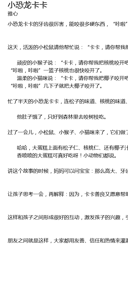 | 讲这个故事的时候,妈妈可以问宝宝:那么高大、牙齿那么厉害的恐龙卡卡,却是很多小动物们的好朋友。为什么呢? | |