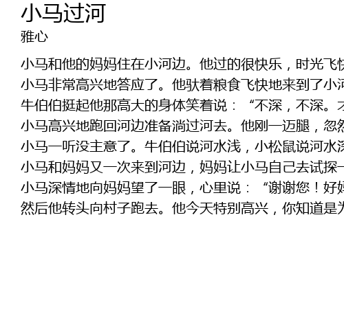 | 小马和他的妈妈住在小河边。他过的很快乐,时光飞快地过去了。有一天,妈妈把小马叫到身边说:“小马,你已经长大了,可以帮妈妈做事了。今天你把这袋粮食送到河对岸的村子里去吧。” | |
