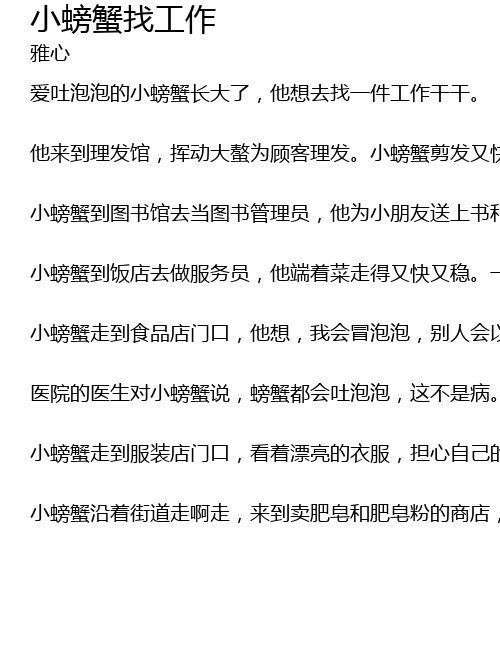 | 爱吐泡泡的小螃蟹长大了,他想去找一件工作干干。 | |