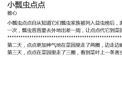 | 一次,瓢虫爸爸要去外地出差一周,让点点代它到菜园巡逻。 | |