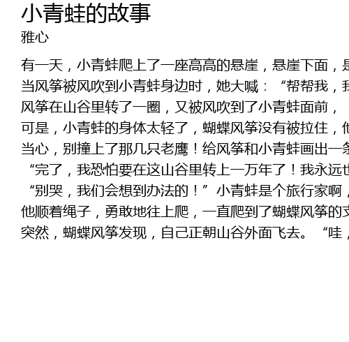 | 有一天,小青蛙爬上了一座高高的悬崖,悬崖下面,是深深的山谷。突然,小青蛙发现,山谷里有一只蝴蝶风筝,她正被风吹得转来转去。 | |