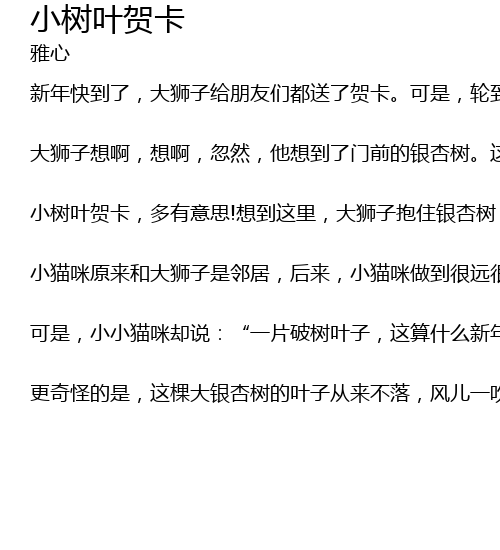 | 小树叶贺卡,多有意思!想到这里,大狮子抱住银杏树,使劲摇啊,摇啊,那片树叶就飘飘悠悠地落下来了。于是,大狮子就把这片小树叶,夹在信里寄给了小猫咪。 | |