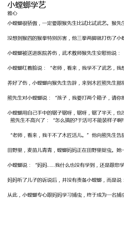 | 小螳螂红着脸说:“老师,看来,我学不了武艺,我想改行学木匠。” | |