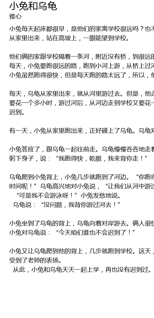 | 乌龟爬到小兔背上,小兔几步就跑到了河边。“你跑得真快,这段路要我得走好长 时间呢!”乌龟高兴地对小兔说,“让我们从河中游过去吧!” | |