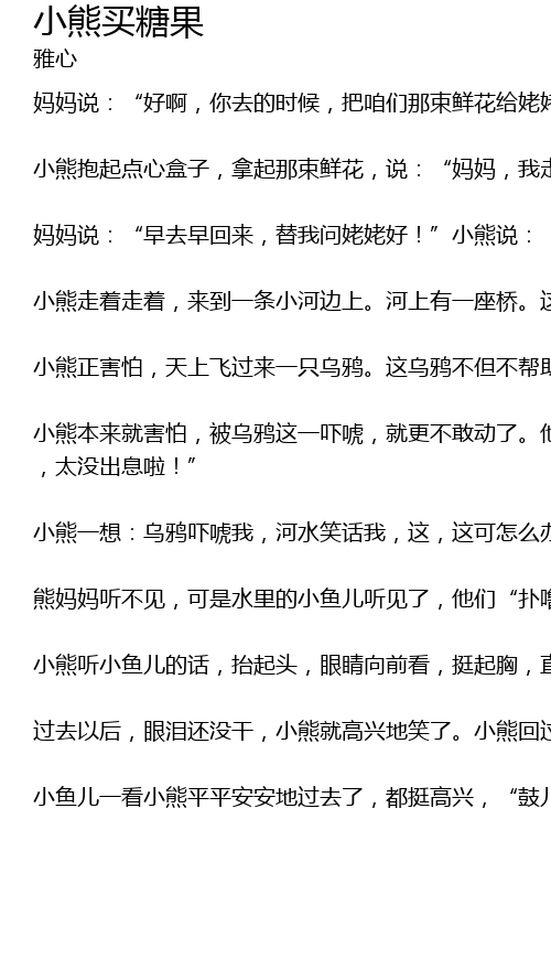 | 小熊本来就害怕,被乌鸦这一吓唬,就更不敢动了。他低头一看河水,河水也在笑话他:“哗哗哗哗,小熊小熊,你怎么这么不勇敢哪,小竹桥都不敢过!这么胆小,太没出息啦 ,太没出息啦!” | |