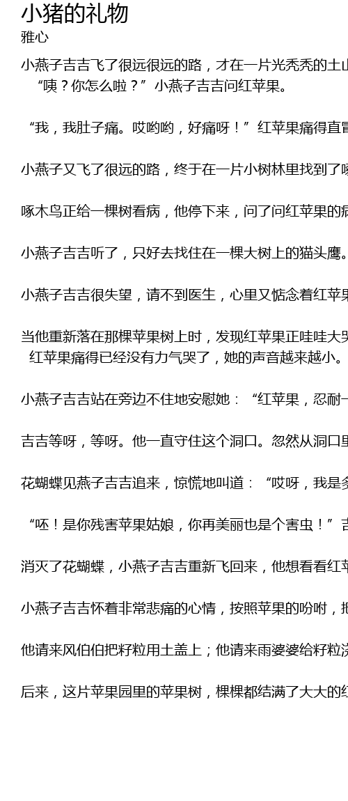| xiǎo yàn zi jí jí fēi le hěn yuǎn hěn yuǎn de lù, cái zài yī piàn guāng tū tū de tǔ shān pō shàng fā xiàn le yī kē shù, yī kē píng guǒ shù. jí jí yòu lèi, yòu kě, yòu è ya, nà me yuǎn de lù, jìng rán zhǐ yǒu zhè me yī kē shù. tā luò dìng hòu, zài xī shū de shù yè zhōng zhǎo le bàn tiān, zhǐ zhǎo dào yí gè hóng píng guǒ. āi yā, zhè shì duō me zhēn guì de yí gè píng guǒ ya. zhè gè píng guǒ hóng hóng de, zài wēi fēng zhōng huǎng lái huǎng qù. hū rán, xiǎo yàn zi jí jí fā xiàn zhè gè píng guǒ zài liú lèi, ér qiě fā chū qīng qīng de kū shēng. | |