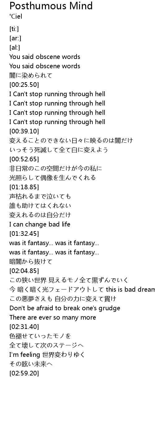 | [02:11.30] | 今 暗く暗く光フェードアウトして this is bad dream |