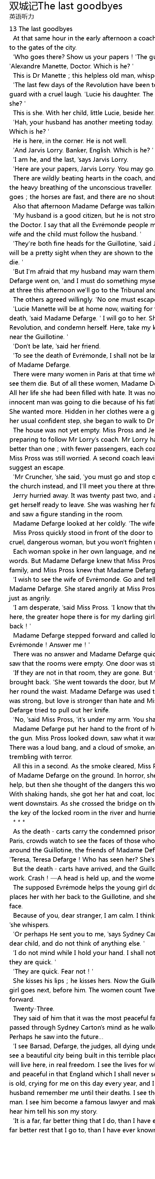 | There were many women in Paris at that time who hated the nobles and wanted to see them die. But of all these women, Madame Defarge was the one most feared. All her life she had been filled with hate. It was nothing to her that an innocent man was going to die because of his father' s and his uncle' s crimes. She wanted more. Hidden in her clothes were a gun and a sharp knife, and with her usual confident step, she began to walk to Dr Manette' s house. | |