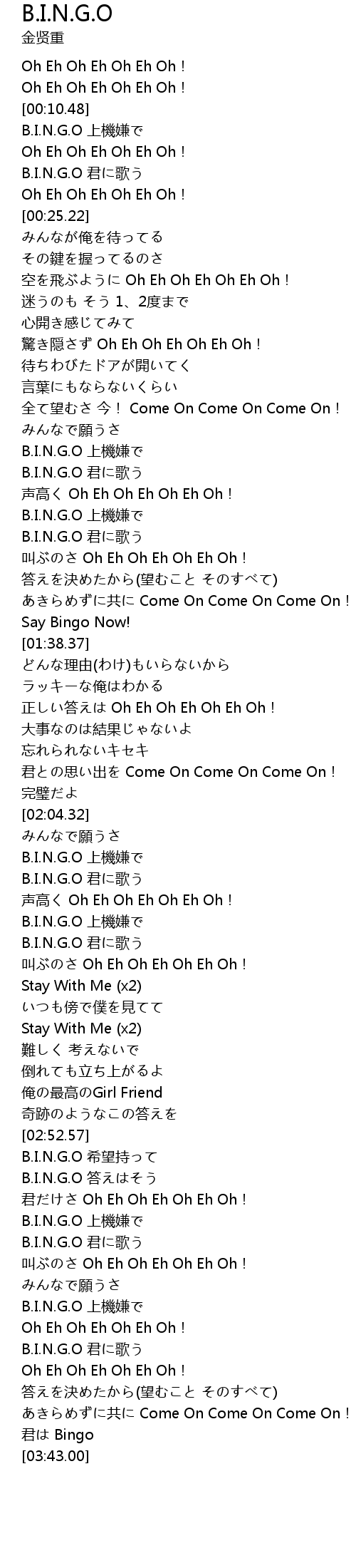 | [01:13.43] | B.I.N.G.O 上機嫌で |