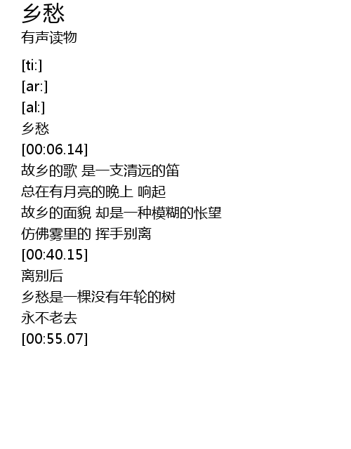 | [00:45.77] | 乡愁是一棵没有年轮的树 |