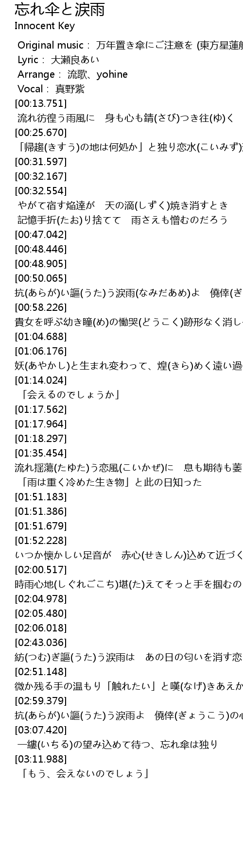 | [03:07.647] | 一縷(いちる)の望み込めて待つ、忘れ傘は独り |