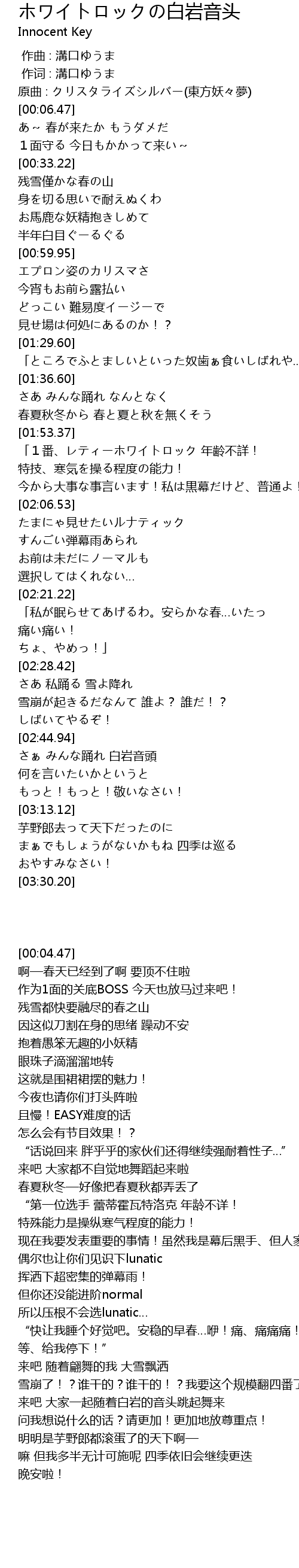| [00:04.47] | 原曲 : クリスタライズシルバー(東方妖々夢) |