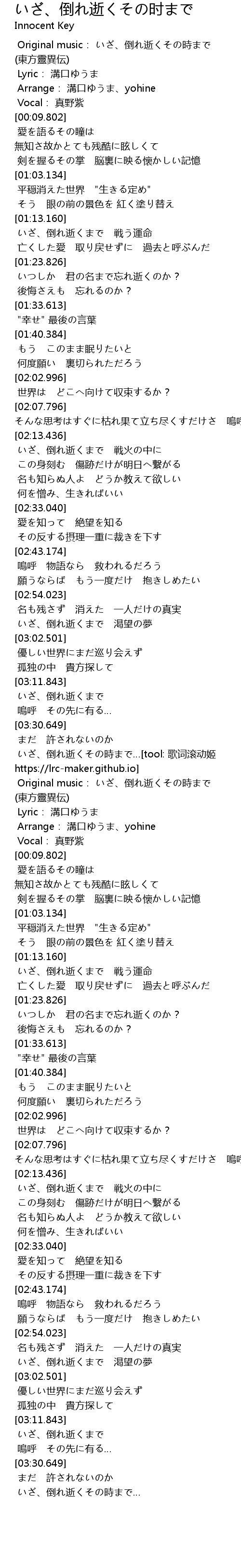 | [00:00.704] | Original music: いざ、倒れ逝くその時まで (東方靈異伝) |