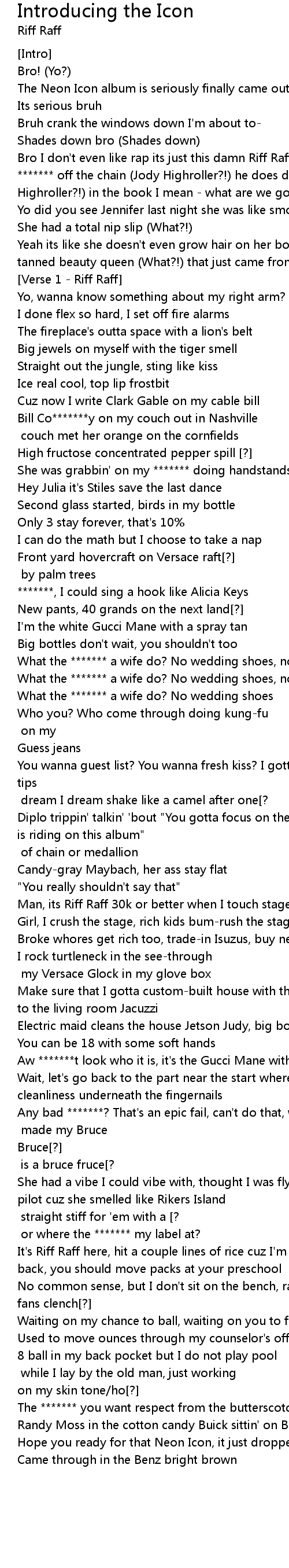 | Bro I don't even like rap its just this damn Riff Raff (what?!) he's just ******* off the chain (Jody Highroller?!) he does damn near everything (Jody Highroller?!) in the book I mean - what are we gonna do about it? | |