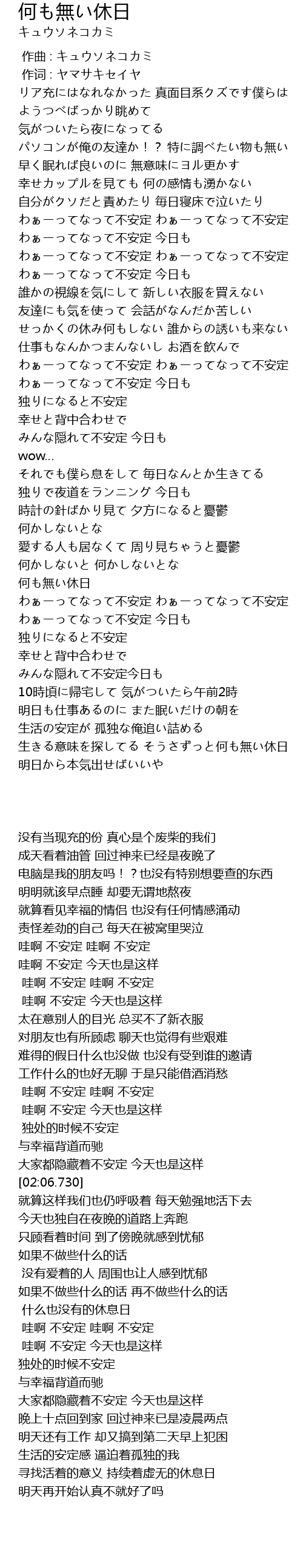| [01:34.250] | せっかくの休み何もしない 誰からの誘いも来ない |