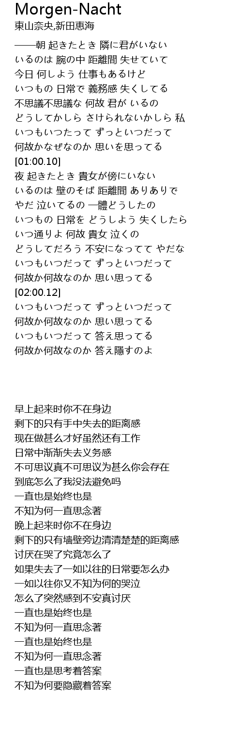 | [00:13.00] | ——朝 起きたとき 隣に君がいない |