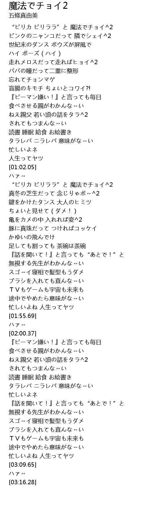 | [01:06.18] | “ピリカ ピリララ”と 魔法でチョイ^2 |