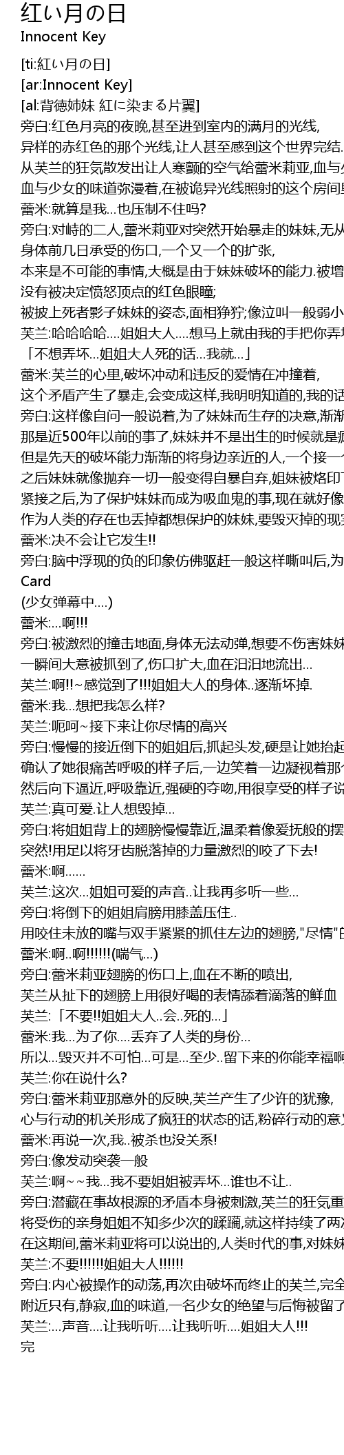| [06:28.460] | 在这期间,蕾米莉亚将可以说出的,人类时代的事,对妹妹强烈的心意,不断的叙述着 |