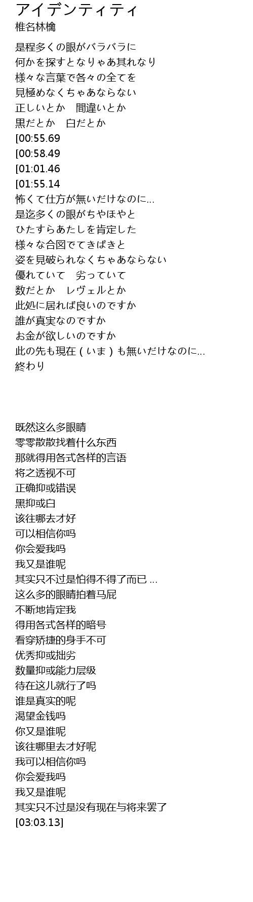 | [02:07.08][01:55.14][01:04.41] | あたしは誰なのですか |