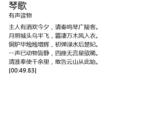 | [00:05.13] | zhǔ rén yǒu jiǔ huān jīn xī, qǐng zòu míng qín guǎng líng kè. |